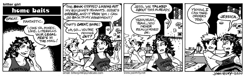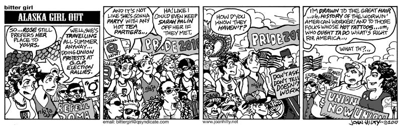 Every year I feel a little guilty about using year-old reference for the Pride parade strip, and then I get to the parade and y’know what? There’s always someone in a boa, or with a whistle, or wearing a T-shirt she only takes out twice a year. Let’s face it, who wears red, green and beige on the 4th of July? Having said that, I still needed to fill out the crowd, so the out-of-town girlfriend from I Wonder makes an appearance here.