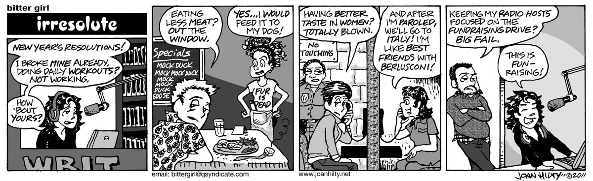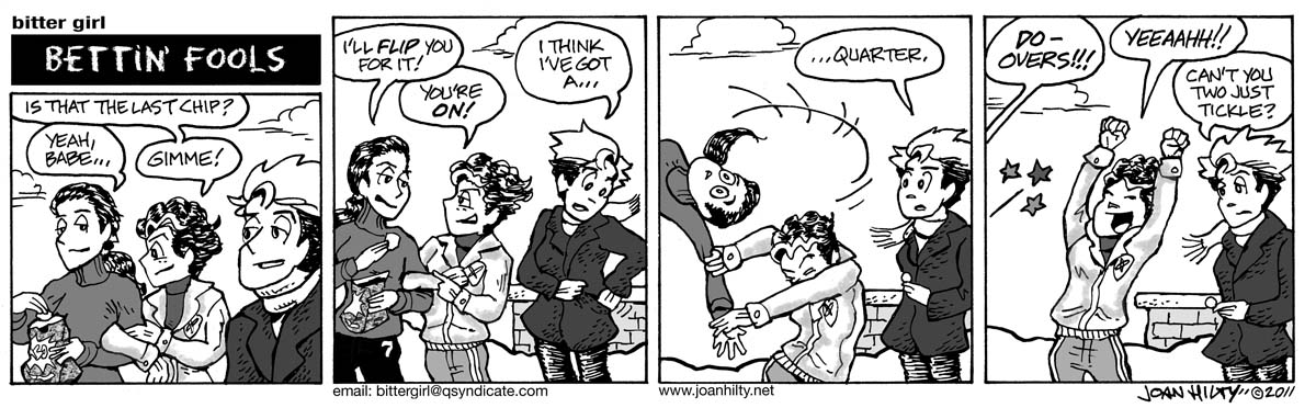 Lord knows if anyone got the Duck-Duck-Goose gag in panel 2 of “Irresolute”, let alone was able to read the blackboard, but that’s what Wikipedia’s for. Oddly, I learned it, and have only ever played it, on cross-country skis.
