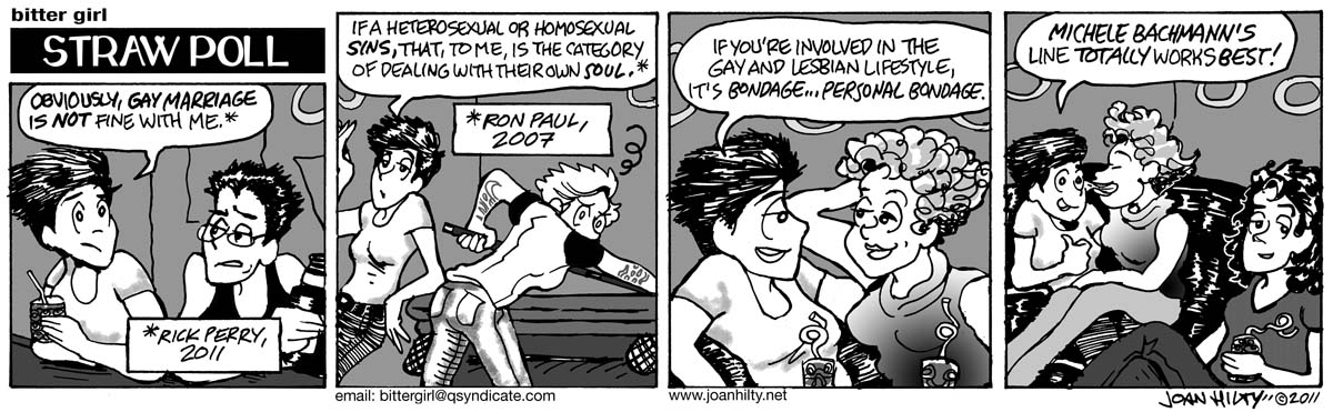 Oh man, I’m so behind. Fortunately, Herman Cain has dropped out ahead of Bachmann, and “Food Fright” kicks off a major romantic storyline for Nikki that’s really heating up now if you check my subscribers, so I can act like it was planned all along.
